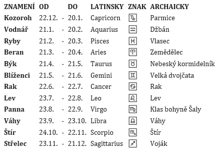 Vodnář, Ryby, Beran, Býk, Blíženci, Rak, Lev, Panna, Váhy, Štír, Střelec, Kozoroh.